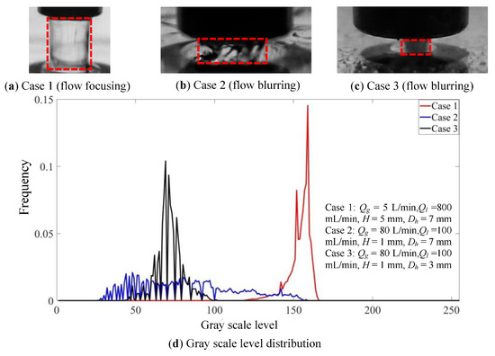 In this section, the basic concept of the gray distribution of the experimental images is described. And in Section 3.2, the relationship between the gray distribution of the experimental images and the flow patterns (flow characteristics) inside the nozzle is qualitatively analyzed through several cases. Through the qualitative relationship between the flow patterns (flow characteristics) and the gray distribution curves, we can study the gas-liquid flow and mixing inside the flow focusing/blurring nozzle.