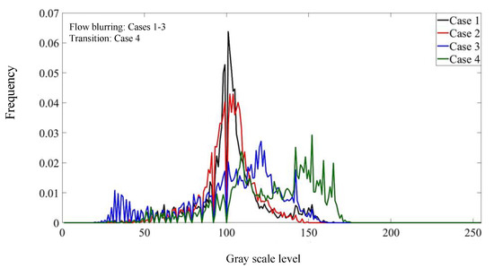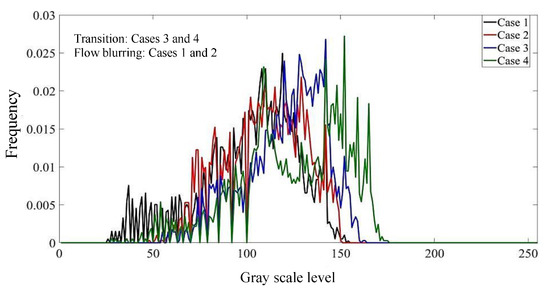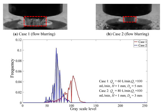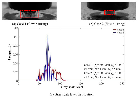 Figure 5a,b show the two-phase flow images in the mixing zone with different mixing intensity. Compared with case 1, the gas-liquid flow in the mixing zone is closer to fog in case 2, and the boundary of the gas-liquid fluid is more fuzzy, which indicates that the gas-liquid mixing intensity in case 2 is stronger. By comparing the gray distribution of case 1 and case 2, it can be found that the average gray scale level of the images is lower when the mixing intensity of two-phase is larger. This is because, when the gas-liquid mixing intensity is relatively high the number of broken droplets is large and the size of the droplets is small, which makes the scattering effect stronger. Therefore, the light entering the image acquisition equipment is weakened and the average gray level of the image is relatively low.