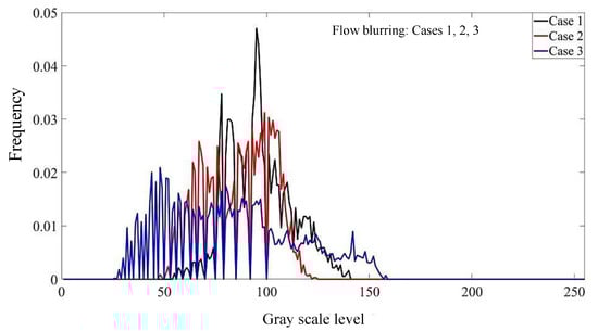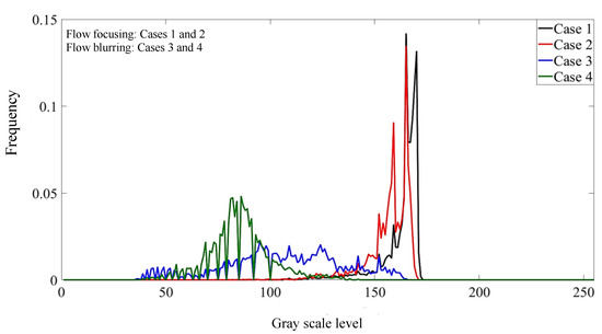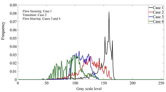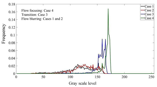 As can be seen from Figure 4, for case 1, the gas-liquid two-phase fluids in the mixing zone do not mix; we can observe the liquid column in the mixing zone, and the boundary of the gas-liquid two-phase fluids is relatively clear, so the flow pattern in the mixing zone is flow focusing. At this time, the gas-liquid interaction in the mixing zone is weak, the light enters the SLR camera through transmission and the brightness of the pixel points is high and uniform, so the image has a high gray level and a good concentration. For case 3, the boundary of the gas-liquid two-phase fluids in the mixing zone is fuzzy, the gas-liquid flow in the mixing zone is close to fog and the gas-liquid mixing is good, so the flow pattern in the mixing zone is flow blurring. At this time, the liquid in the mixing zone is broken into tiny droplets by gas, and the light enters the SLR camera by scattering. The brightness of the pixels is low but still relatively uniform, which reduces the gray level of the image, but the concentration of gray distribution is still very good.