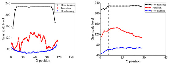 As can be seen from Figure 14a, the gray scale level of the radial flow field is larger, and the gray distribution is more uniform during flow focusing. The obvious gas-liquid interface makes the gray scale level of the flow field lower when the radial position is smaller or larger. When the flow pattern is flow blurring, the gray scale level of the radial flow field in the mixing zone is low, but the gray distribution is still relatively uniform. The thickness of the two-phase mixture center region is relatively large, which results in the lower gray scale level of the flow image in the radial center region but actually the radial gray scale distribution is relatively uniform. In the transition mode, the gray scale level of the radial flow field is close to that of the flow blurring, but the gray distribution curve is very nonuniform. This is due to the instability caused by the strong radial inertia force of the gas acting on the liquid.