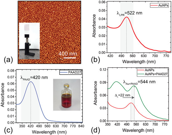 (a) AFM image of the AuNPs monolayer on a glass substrate. In the inset, a photograph of the sample. Spectral response of the AuNPs monolayer surrounded by (b) air and (c) PAAD-27; In the inset, a photograph of the photo-aligning material. (d) Absorbance response of the AuNPs monolayer covered by the PAAD-27.