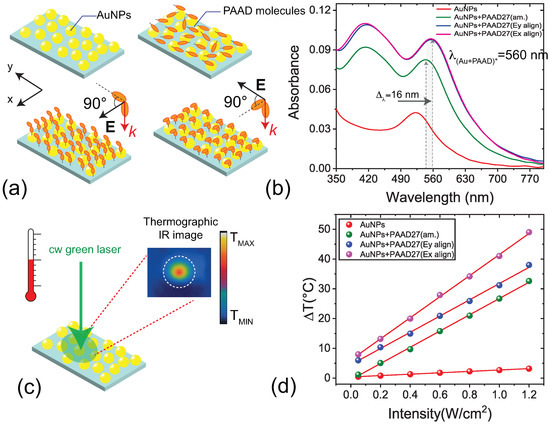 (a) Sketch of the AuNPs monolayer on a glass substrate before (top, left) and after the deposition of the PAAD-27 material (top, right); orientation of the PAAD-27 molecules after the exposure to UV radiation for two different polarizations (bottom). (b) Absorbance response of the AuNPs monolayer in the air (red curve), after the deposition of the PAAD-27—before (green curve) and after the exposure to polarized UV radiation with different polarizations (blue and magenta curves); (c) Sketch of the photothermal measurement. (d) Photo-thermal response of the AuNPs monolayer in air and after the deposition and alignment of the PAAD-27.