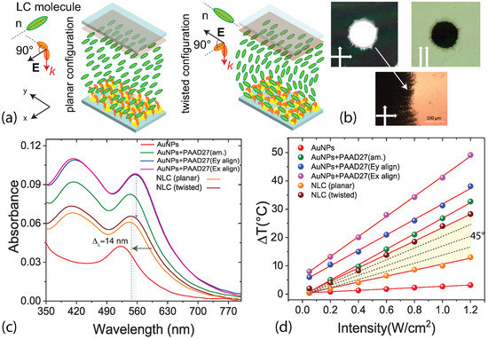 where is the AuNPs surface density, is the average AuNP volume, is the thermal conductivity of the host medium, is the AuNPs dielectric permeability, and are the AuNPs and host medium dielectric permittivity, respectively. From Equation (2), it is evident that the temperature variation exhibits a strong enhancement under the Frölich condition, in which the quantity assumes a minimum value, a condition that occurs if Re[] = −2 [32]. Equation (2) shows also that the temperature variation varies linearly with the intensity of the pump beam (I), used to excite the resonance of the AuNPs, and strongly depends on the optical and thermal characteristics of the medium that hosts the AuNPs, expressed by and , respectively. This behavior was experimentally demonstrated by illuminating the AuNPs with different pump beam intensities I and by monitoring the maximum induced for each I value. By monitoring the temperature values of the central pixel of each hot-spot of the thermographic images (Figure 2c), which corresponds to the warmest point, we plotted the temperature variation = versus the impinging intensity I. Successively, we repeated the photo-thermal experiments (Figure 2d) by fixing the intensity range (I = 0.05 − 1.2 W/cm2) for the cases of AuNPs monolayer in air (red sphere) and covered by the PAAD-27 molecules before (green sphere) and after exposure to UV light of two different polarization directions (blue and magenta spheres). As predicted by Equation (2), the behavior of as a function of I can be easily fitted with a linear curve. For the maximum I considered we acquire a of about (3.2 ± 0.3) °C for the AuNPs monolayer in air, (32.6 ± 0.3) °C for the sample where AuNPs are covered by PAAD-27, and of about (49.0 ± 0.3) °C and (38.0 ± 0.3) °C for AuNPs-PAAD-27 samples acted on by UV light with two different polarization directions. The differences in the measured values acquired for the four different cases is related to the variation of the AuNPs plasmonic band induced by changes in the characteristics of the host medium surrounding the AuNPs. In particular, Figure 2b shows that in the case of not aligned PAAD-27, there is an increase of the sample absorbance, and this is also observed when the PAAD-27 molecules are aligned. However, in this latter case, the difference in the temperature variations are not due to a change in the sample absorbance but to a different value of in the two cases: as a matter of fact, the observation that the plasmonic band does not change for the two different alignment conditions indicates that no variations occur in the refractive index of the PAAD-27, which corresponds to no variation in the Frölich condition. Therefore, a prediction of the sample temperature variation goes through a determination of the value of the medium hosting the AuNPs, which is made of glass and PAAD-27 layer. We can say that the PAAD-27 alignment induces a reversible and repeatable thermal anisotropy due to an induced change in the thermal conductivity value of the PAAD-27, which turns out to be different for the two different polarization directions of the resonant impinging light. As demonstrated in a previous work [18], we are able to calculate the thermal conductivity value by detecting variations of sample temperature as a function of the laser intensity; thus, we can determine the thermal anisotropy of the PAAD-27 layer using Equations (1) and (2). Following the procedure illustrated in [18], the values of the PAAD-27 in the three cases are measured as: 0.77 W(° m) for the amorphous PAAD-27, 0.32 W(° m) for the aligned PAAD-27 and 0.40 W(° m) for the aligned PAAD-27. These results confirm that it is possible to modulate the thermal behavior of PAAD-27 material by means of polarized light. As mentioned above, PAAD-27 can be used to align liquid crystals; for this reason, we have studied the behavior of a sample of AuNPs + PAAD-27 modified by adding a nematic liquid crystal (NLC, see Materials and Methods section) to investigate how a variation of the optical properties of the new medium (represented now by PAAD-27 plus NLC) surrounding the AuNPs, determines variations of the thermal efficiency of the whole system that are not related to a change in the value of the thermal conductivity of some of its components.