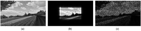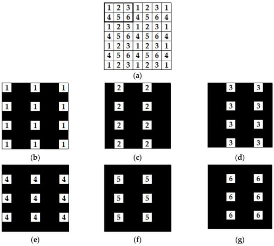 Figure 2 shows how the pixels of an original image are separated. We group pixels and then generate the separated images. Figure 2a shows a case where a single group consists of 6 pixels (). Figure 2b shows the separated image of pixels assigned “1” in Figure 2a. We generate six pixel-separated images as shown in Figure 2b–g, and calculate the CGHs for each image.