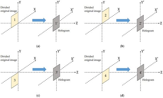 Recording of CGH using time-division reconstruction method: (a) recording of divided original image 1, (b) recording of divided original image 2, (c) recording of divided original image 3, and (d) recording of divided original image 4.