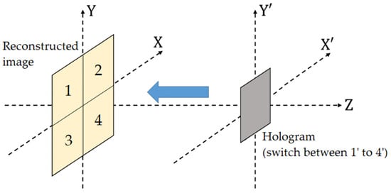 Figure 3 shows an example of calculating CGH when the original image is divided into four after adding a random phase. As the centers of each divided block have an offset from the center of the CGH, it is necessary to use off-axis diffraction to calculate the propagation from divided blocks of CGH. Several off-axis calculations have been proposed [19,20], but this study used that proposed in [20]. Figure 4 shows the reconstruction process. High-speed DMD was used and, by switching the CGHs at high speed, we obtained the entire reconstructed image.