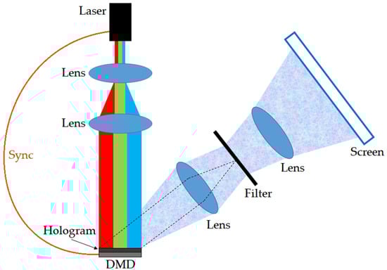 The optical system shown in Figure 5 was used for the full-color reconstruction. We used a method of time-division switching for RGB light sources [21]. Only the proposed method (d) in Table 2 (Time-division reconstruction + Uneven color correction) was validated, as it requires three times the binary CGHs than the proposed method.