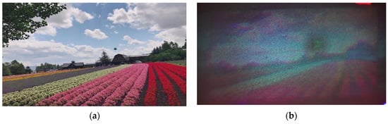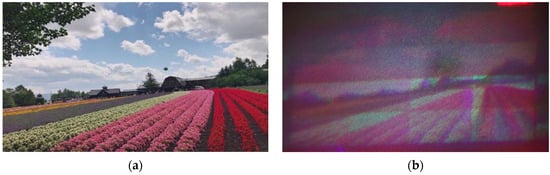 CGHs generated using the method outlined in Figure 3 should be binarized before displayed on DMD. However, this study binarized CGHs after the original image was divided, so the relative brightness information between each CGH is lost. Thus, uneven colors occurred in the reconstructed image. Figure 6 displays the reconstructed image using the optical system in Figure 5. Figure 6a,b show the original color image and the optical reconstruction image with color unevenness, respectively.