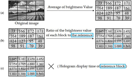 In Figure 7a, the average brightness values of each divided block of the original image are calculated. In Figure 7b, an arbitrarily divided block is defined as a reference (the blue rectangular indicates the reference block), and the ratio of the average value per divided block to the reference block is calculated. In Figure 7c, multiplying the ratio by the hologram display time of the reference block, the projection times of each divided block can be determined and set in the DMD. The reference block should be set so that the projection time of each block does not exceed the performance of the DMD. The calibration of the projection times is required for each new image projection. However, the calibration is not complex and time-consuming.
