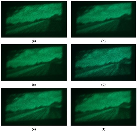 Figure 10 shows the results of an optical experiment with a single color. Each method in Figure 10a–f corresponds to methods (a)–(f) in Table 2. Figure 10d has a higher contrast than Figure 10a. Compared to Figure 10a, applying the multi-random phase or pixel separation methods reduces speckle noise and improves the image quality in each reconstructed image. Subjectively, there is no significant difference in the quality of the reconstructed image using the multi-random phase method and the pixel separation method.