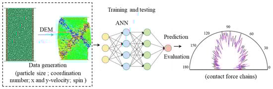 Figure 1 shows the flowchart of the proposed ML-based modelling framework. The remainder of this paper is organized in the following manner. First, the research background is briefly introduced in Section 1. Then, the methodology of this study is explained in Section 2, which includes DEM simulations, data processing, dataset generation, and the construction of ANN model. Section 3 presents the results of the performance of the ANN model, which is evaluated using the ground truth of the DEM data of contact forces [35]. Besides, a detailed parametric study on the effects of features and data size on the model performance is also presented. The main conclusion of this study is given in Section 4.