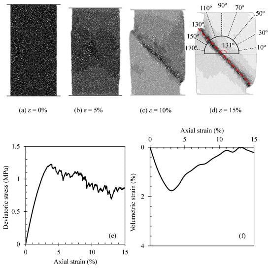 Figure 2a–d show the evolution of particle displacement during the shearing process. We can see that, with the sketch of a simplified protractor on Figure 2d, the sample exhibits failure along a shear band oriented at 131° (rotating counter-clockwise) from the horizontal. The typical curves of deviatoric stress vs. axial strain and volumetric strain vs. axial strain are shown in Figure 2e, f, respectively. The peak deviatoric stress is about 1.2 MPa under the confining pressure of 300 kPa.