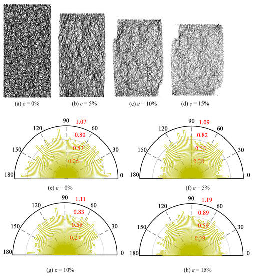 Figure 3a–d show the evolution of contact networks within the sample at the axial strains of 0%, 5%, 10%, and 15%, respectively. It is seen that the distribution of contact networks is uniform and isotropic at the initial state. As shearing progresses, the contact force distribution shifts slightly from the isotropic state to the vertical-prevailing state. Consequently, the distribution frequency undergoes a significant loss in the horizontal direction and a distinct gain in the vertical direction. For the ease of quantifying the heterogeneous distribution of contact force networks, all the data were discretized into a set of equally spaced bins and characterized by an angular histogram, as shown in Figure 3e–h. It is seen that the evolution of the frequency of contact forces in each bin during the whole shearing test is clearly visualized.