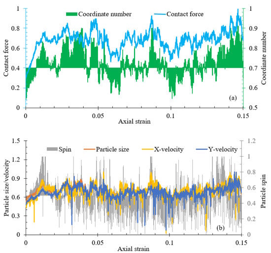 The biaxial test was simulated as per the following procedure. Four rigid sidewalls were first built to enclose and isotopically compress the sample to a target confining pressure of 300 kPa. Then, the left and right rigid walls were replaced by a flexible membrane [27,37,38] that was formed by a set of individual rows of frictionless and uniform 2 mm-diameter spherical particles linked by strong and flexible contact bonds and apt to flexible deformation. More information about the flexible membrane technique can be found in De Bono et al. [39]. Finally, the sample was compressed at a constant strain rate of 5 × 10−5 m/s until the axial strain of 0.15 was reached. The parameters used in the simulation are given in Table 1.
