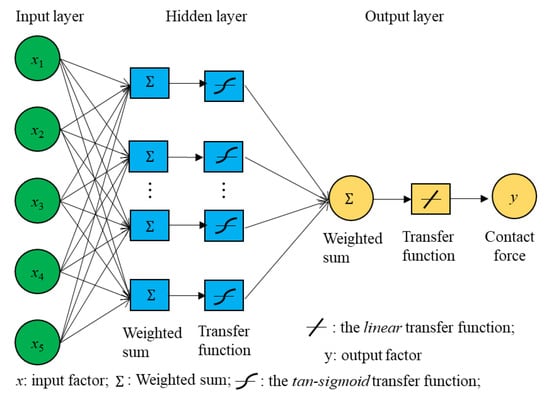 A typical multilayer feedforward ANN model is designed and shown in Figure 5. It consists of nodes or neurons in three layers: an input layer, an output layer and a hidden layer. The links between nodes of adjacent layers have weights and biases associated with them. The purpose of learning is to assign correct parameters (i.e., weights and biases) for these edges. For the nodes in the input layer, their function is to pass the information to the hidden nodes through the edges with associated weights and biases and no computation is performed in any of the input nodes. The number of nodes used in the input layer is equal to the number of input features. For the nodes in the hidden layer, they perform computations by summing the weighted inputs and the bias and transferring the computational result through the tan-sigmoid transfer function, f(x) = 2/(1 + e−2x) − 1 [41]. The number of neurons in the hidden layer is 10. Generally, the number of hidden neurons has a significant influence on the power of the network. Increasing the number of hidden neurons increases the network performance, but needs more computational resources. The output layer has one node with a linear transfer function, f(x) = x. This node receives input from the hidden layer and performs similar computations as illustrated for the hidden nodes.