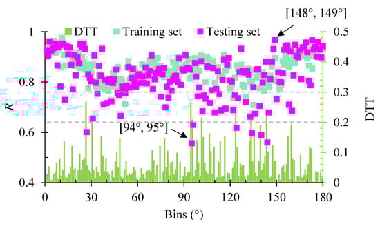 The dimensions of each feature in the training set are 40,000 × 180, where 40,000 is the number of records and 180 is the number of bins. Note that all bins are independent of each other. The ANN model is trained and tested in each bin. The R values of all bins for the training set are shown in Figure 6. We can see that the trained models perform well in all bins, with the maximum and minimum R values being 0.975 and 0.709, respectively. The median value and standard deviation of R for the training set are 0.859 and 0.05, respectively. This result indicates that there is a nonlinear functional relationship between the input (i.e., five particle-scale features) and output (i.e., contact force). This result also means that the anisotropy of CFC in sheared granular systems represented by a rose diagram can be estimated separately using the proposed ANN model, which was impossible before such a technique was developed. Compared with other bins, the bins in the ranges of [30°, 60°] and [120°, 150°] have smaller values of R mainly because of the development of the shear band. Such a result is reasonably expected, because as Cheng [16] noted, higher frequencies of contact gain and contact loss occur within the shear bands, which leads the trained model to be less effective in the directions aligned with the shear band.