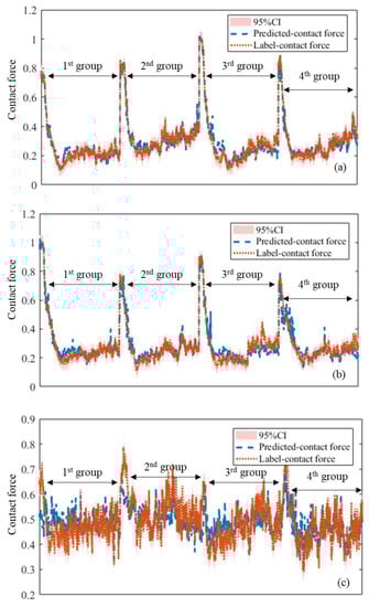 Figure 15 shows the cumulative distributions of R for ML07–ML11 with different data sizes. The change in the size of the training set is made by deleting records spaced at a constant interval from the original simulation data. It is seen that the performance of the tested model is largely improved with the increase in the size of the training set. Figure 16 compares the predicted CFC with the ground truth for ML11 with the smallest data size. It is a bit surprising to find that although only 2500 records were used in training the model, the degree of matching between the estimated contact force and the ground truth, as compared to Figure 11, is not severely affected. The practical problem of how much data is needed to train the ANN model is a controversial issue and has not been solved to date.