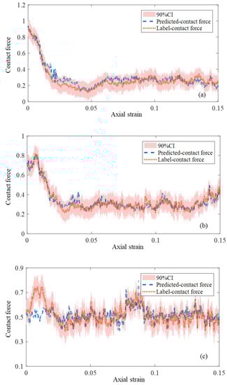 Two bins (i.e., [10°, 11°] and [5°, 6°]) with good model performance in the training set and a bin ([42°, 43°]) located within the shear band with a smaller value of R were selected for comparing their training output with the ground truth. The comparison results are shown in Figure 7. For the bins of [10°, 11°] and [5°, 6°], we can see that the estimated contact forces agree well with the ground truth derived from the DEM simulations. Along the horizontal direction, the contact force decreases before shear band forms and remains stable afterward. For the bin of [42°, 43°], we can see that the predicted contact forces match the fluctuated ground truth, although there is some difference between them. The above results demonstrate again the high capability and robustness of the proposed ANN model.