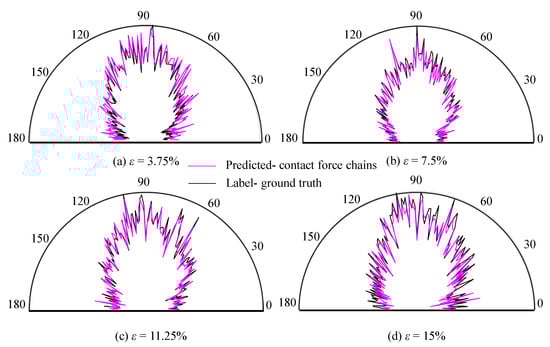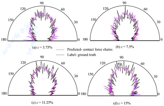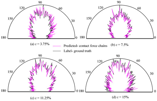 Figure 11 compares the rose diagrams of the predicted CFC with the ground truth at four different strain levels of 3.75%, 7.5%, 11.25%, and 15%. We can see that the predicted CFC is in good agreement with the ground truth during the whole shearing test. This overall agreement suggests that our ANN model is able to predict the anisotropy of the CFC in a quasi-statically sheared granular assembly and highlights the significant contribution of this study.