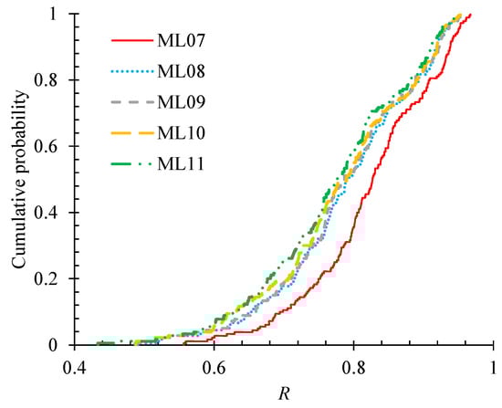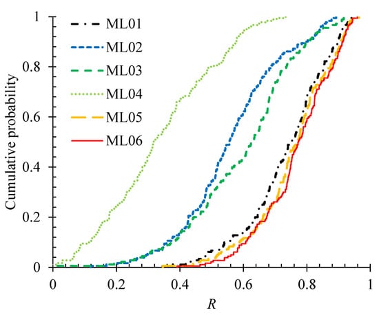 The R values for the selected individual features (i.e., with all other features being ignored) in ML01-ML05 and for the combined features of particle size and coordination number in ML06 were calculated based on the same set of simulation data. Their cumulative distributions of R are shown in Figure 12. It can be seen that the features of coordination number and particle size, with the median values of 0.749 and 0.768, respectively, show a much higher level of importance for the CFC prediction than the other features. For the ML04, the median value and standard deviation of R are 0.316 and 0.172, respectively, suggesting that the particle spin only plays a minor role in estimating the anisotropy of CFC. By comparing ML01 and ML05 with ML06, it is found that the combined features of particle size and coordination number have the highest level of influence on the CFC estimation.