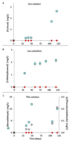 Maillard volatile compounds formation in wine model solutions containing (A) arabinose (Ara), (B) leucine (Leu), and (C) phenylalanine (Phe), in the absence (