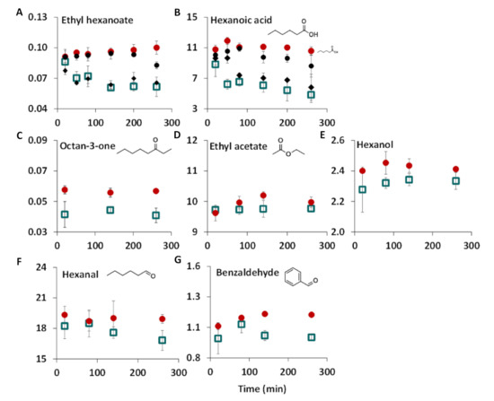 ) at room temperature in dark during 260 min for (A) ethyl hexanoate, (B) hexanoic acid, (C) octan-3-one, (D) ethyl acetate, (E) hexanol, (F) hexanal, and (G) benzaldehyde.
