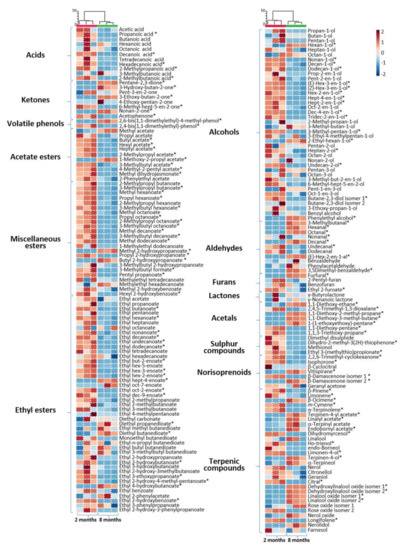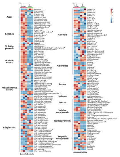 Heat map representation corresponding to the 177 volatile compounds of the white wine in contact with chitosan-genipin films during 2 and 8 months. The relative content of each volatile compound is illustrated through a colour scale (from dark blue, minimum, to dark red, maximum). * Significance at p < 0.05. Detailed data in Table S1.