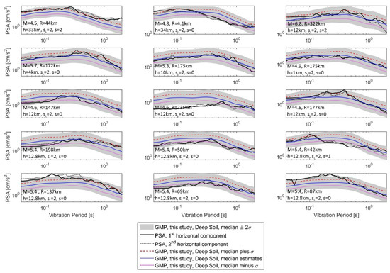 The only GMPEs we can compare our results to (as they also simultaneously consider effects of deep soils and deep geological sediments) are the ones developed for California based on 1482 strong-motion records from earthquakes in the western United States [21]. Moreover, the author of these GMPEs used the same categorical variables as we did (see Table 2) [21], and the site amplification can also be assessed simply by analyzing corresponding scaling coefficients. For the vibration period of T = 0.04 s, for example, Californian GMPEs indicate 30% lower PSA amplitudes at the deep soil atop deep geological sediments than at the rock sites, which is very similar to what we obtained for T = 0.05 s. Furthermore, according to the Californian GMPEs [21], the amplification exists for the vibration periods longer than 0.3 s, and the maximum amplification is ~1.7, which is somewhat smaller than what we obtained.