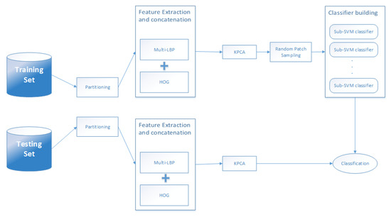 The proposed algorithm works as follows: First, each image is partitioned into several 50% overlapping regions/blocks. Then, the LBP and HOG descriptors are used to individually extract features from the generated image patches. Since the previous step generates high dimensionality descriptors, potentially including redundancies, the KPCA method is used in order to extract the most significant feature patterns of the descriptors. Next, the reduced descriptors of the image patches are normalised and fed to the classification module. Finally, a number of patches are randomly sub-sampled within each image training set in order to build multiple SVM classifiers from each subset. The validation of the proposed algorithm was performed through extensive experiments using a single sample per person as per real world conditions. A combination of the final results of the performances generated from all the sub-classifiers is performed with a union rule. Figure 1 depicts the process.