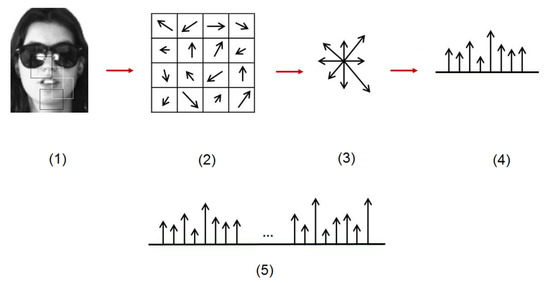 The process of extracting HOG features from face images: (1) Original face image after patching (2) partition of each patch into cells (3) extraction of HOG features from each cell (4) Concatenation of HOG features of each cell (5) Concatenation of HOG histograms of all cells into a single histogram.