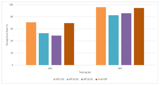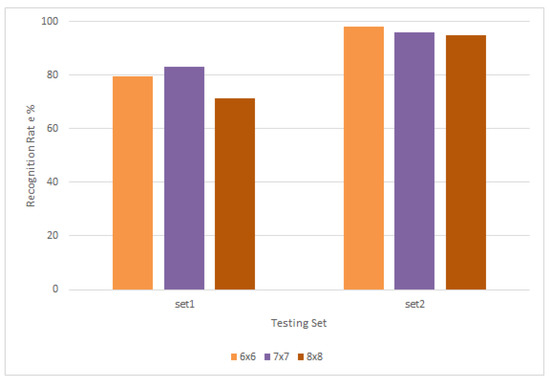 It is observed that each LBP neighbourhood gives different results depending on the testing set and type of occlusion present in the images, with scoring the highest rate for both sets. It is therefore concluded that the combination will tackle different types of challenges as compared to single-scale. From the same figure, it is seen that the multi-LBP goes as high as 95% for set2 and averaging around 70% for set1. Next, when extracting HOG features, the following cell sizes have been used: 6 × 6, 7 × 7, and 8 × 8 as seen in Figure 10. The results show that each cell size works differently for each testing set. In the same figure it could be seen that the recognition rate for set1 goes up to 83% and 96% for set2 with cell size 7 × 7. The last rate is lower compared to cell size 6 × 6, which reaches 98%. Cell size 8 × 8 records lower recognition rate than both smaller cells. It is to be noted that the smaller the cell, the more features HOG produces as their number increases.