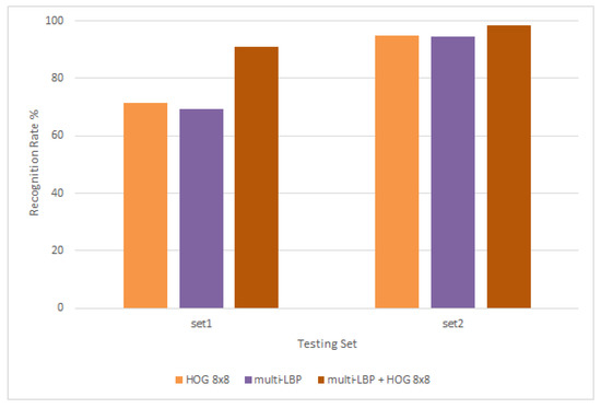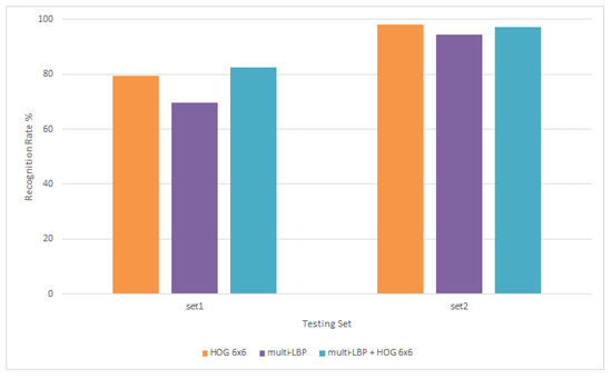The second set of experiments focused on the combination of both HOG and LBP features for classification. First, multi-LBP features used previously (see Figure 9) are concatenated with HOG features from Figure 11. Results in Figure 11 show that although the recognition rate for the combination is higher, especially for test set1 reaching as high as 81%, the improvement is slight and insignificant.