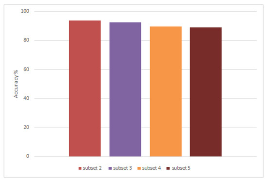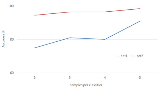 In the third set of experiments, the number of samples used per SVM classifier is varied in order to find the best subset. Figure 13 presents the results of the conducted experiments decreasing the number of samples each time. For testing set1, the accuracy rate sees a noticeable increase as the number of samples used decreases, starting from 75% when the number samples p = 6 and going to a highest of 91% when p = 3. The same observation for testing set2, as it starts from 94.5% when p = 6 going up as p decreases and rating 98.5% when p = 3.