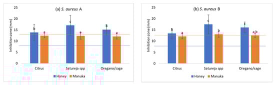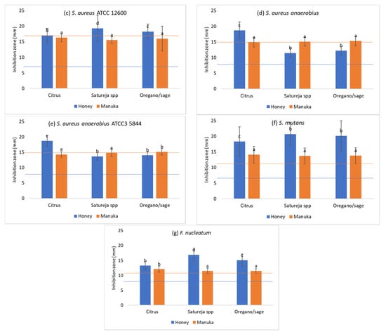 In well diffusion assays, all honey samples had an antibacterial effect against pathogens (and reference strains) when compared with artificial honey, where only the osmotic effect is considered (Table 9, Figure 1a–g). The average of inhibition zones from honeys of Satureja spp. were 16.7 ± 4.1 mm, oregano and sage 15.9 ± 3.5 mm, and of citrus 15.9 ± 3.9 mm indicating that samples of Satureja spp. were among the most effective, particularly against S. aureus A, S. aureus B, S. aureus ATCC 12600, S. mutans, and F. nucleatum. The most sensitive strain was proven to be S. mutans, with an average inhibition zone of 19.5 ± 4.7 mm and the least sensitive being S. anaerobius and F. nucleatum, with average inhibition zones of 14.0 ± 3.8 mm and 14.3 ± 3.1 mm, respectively, which indicates differences among the susceptibility of the strains (ANOVA F = 25.64, p < 0.05). Almost all honey samples were more effective against pathogens than the manuka honey. Overall, the manuka honey gave an average inhibition zone of 13.7 ± 2.2 mm in comparison to 16.0 ± 4.0 mm of the local samples. In these experiments, F. nucleatum was the least sensitive to manuka (mean zone 11.7 ± 0.9 mm) and S. aureus ATCC 12600 the most sensitive (mean zone 15.9 ± 2.5 mm).