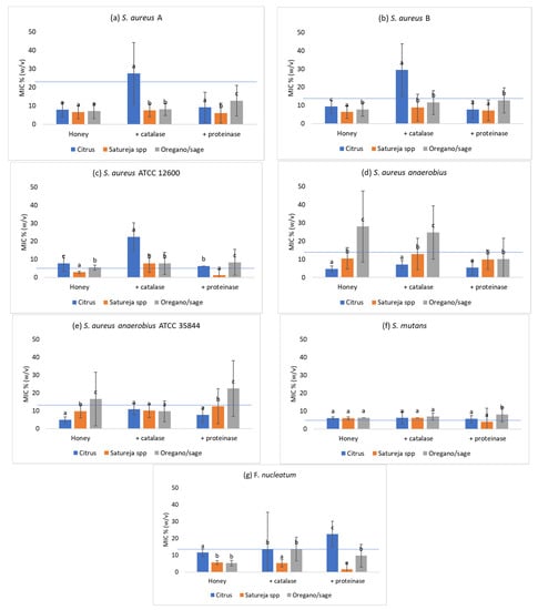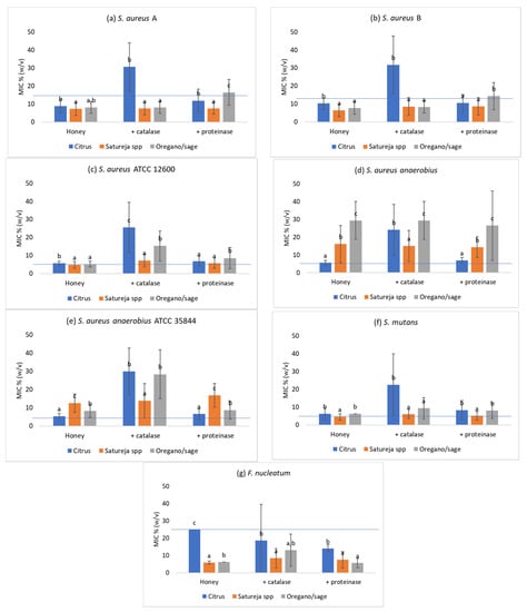 (a–g): Minimum inhibitory concentration of local (n = 60) honey samples treated with and without catalase or proteinase as well as manuka honey (n = 1) against seven oral pathogens with artificial saliva as diluent. Different letters indicate differences among the types of honey within each treatment. Line (blue) indicates the MIC value of manuka.