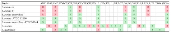 All strains were tested for their susceptibility in common antibiotics. S. aureus (A) and (B) (both methicillin and vancomycin resistant) were proven to be multi-resistant in 66.7% of the drugs (Figure 4). S. mutans. was also multi-resistant in 7 out of 19 antibiotics. The two S. aureus reference strains were sensitive in all tested antibiotics, while F. nucleatum was resistant only in ampicillin (10 μg) and erythromycin (15 μg).