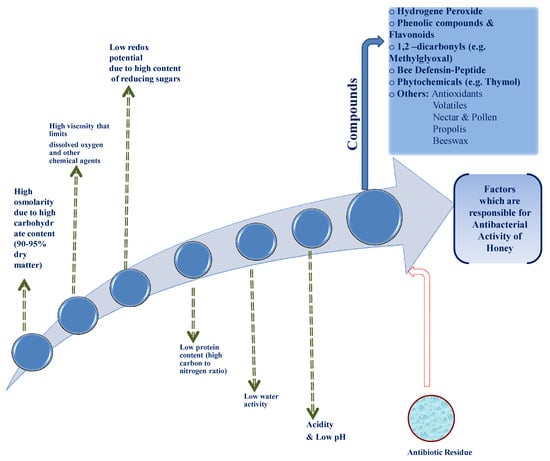 Schematic representation of the main factors involved in antibacterial activity of honey.
