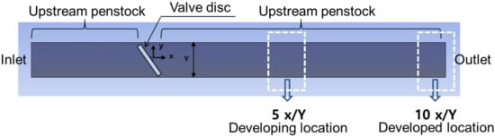 For the small disc opening of 20% at location 5 x/Y, wake region containing vortices induced were generated from the upper side direction behind the valve disc owing to the high disturbance of the flow. The higher turbulence owing to vortices was observed for the k − ω model expressed with higher turbulence kinetic energy as shown in Figure 5. With flow passing through the gap between the disc and pipe wall, the increased reattachment point toward the downstream direction for the k − ω model was observed. Flow mixing with vortices is seen to be developed with wake and recirculation regions for the SST model. Meanwhile, smaller turbulence kinetic energy and wake region were expressed by the model. With increasing valve size in the case of DN 400, the tendency that less velocity changes through the valve disc was expressed with smaller vortex regions in the stream-wise direction, compared to larger changes in the case of the DN 80 valve. With developed flow at location 10 x/Y, each flow passing through the gap was mixed. With increasing valve size, flow mixing was seen to develop in the upper side. This is due to relatively larger flow in the gap between the disc and wall of the valve.
