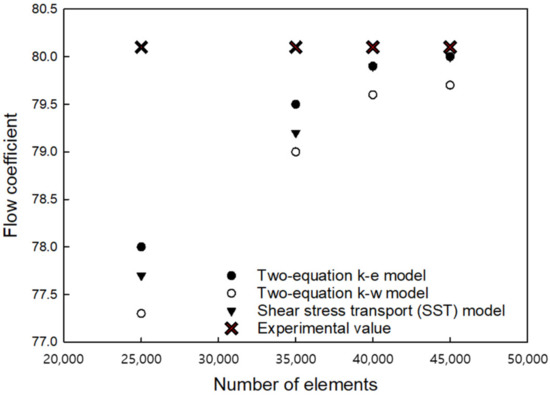 The mesh size dependence study was performed with numerical calculation of the flow coefficient by means of Equation (15), for the representative DN 80 butterfly valve with 50% opening percentage with respect to turbulence models by successively decreasing the element size with a structured grid—a coarse grid with 250,000 meshes; a medium grid with 350,000 and 390,000 meshes; and a fine grid with 450,000 meshes. The number of mesh elements was increased gradually until the solution becomes independent of the mesh density while avoiding skewness and aspect ratio violations [52]. The results are listed in Figure 2. The resulting variations in the solution decreased with decreasing the element size and the results obtained for cell resolution of approximately 400,000 were selected in the present study. In the same manner, mesh element was chosen, 380,000 and 360,000 for the DN 262 and DN 400, respectively.
