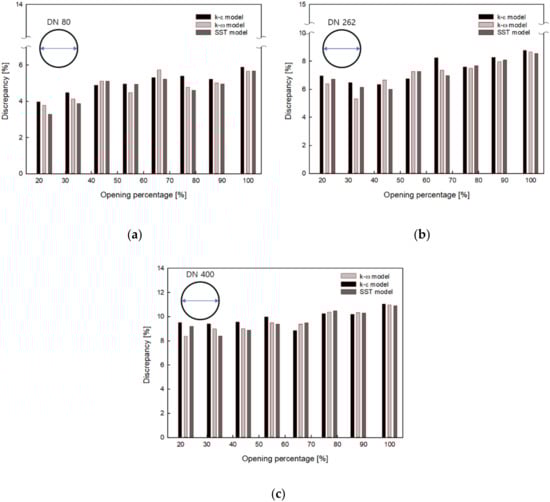 Discrepancies of flow coefficient results for the different turbulence models with different-sized valves and opening percentage: (a) DN 80 valves, (b) DN 262 valves, (c) DN 400 valves.