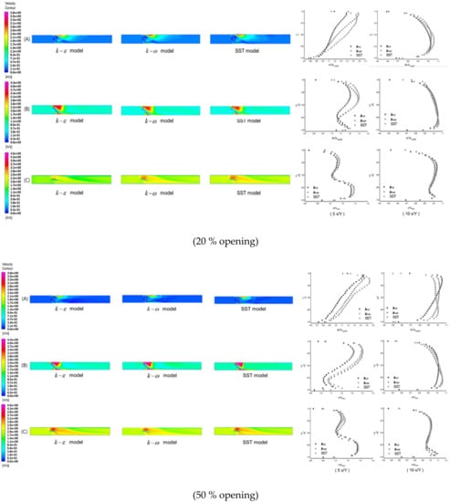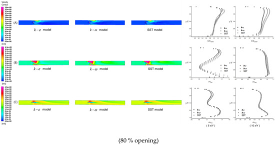 Velocity contour and profile with different opening for the , , and SST turbulence models: (A) DN 80, (B) DN 262, (C) DN 400.