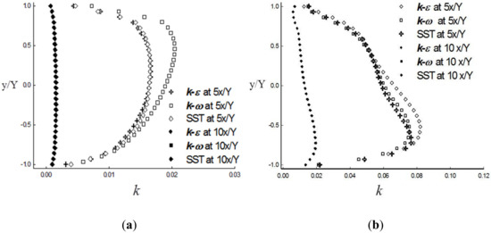 According to the assumption of the two-equation method of model and model, the time-averaged values based on the simplified assumptions: Reynolds averaging, Boussinesq approximation, Prandtl hypotheses, etc. [53] These time-averaged assumptions require turbulence model constants to account for turbulence, therefore, in this study, the effects of turbulence model constants should be assessed by the sensitivity study. For the present sensitivity study, the methods developed by the Błazik-Borowa [37,54] and the group of Pelletier [55] were adopted. The main flow properties based on the time-averaged values were described as follows: the stream-wise flow-velocity (u), turbulence kinetic energy (), turbulence dissipation rate (), turbulent eddy viscosity () for the two-equation of turbulence model, and stream-wise flow-velocity (u), turbulence kinetic energy (), turbulence specific dissipation rate (), turbulent eddy viscosity () for the two-equation of turbulence model. The sensitivity of the flow properties to the constants for each turbulence model was examined with sensitivity coefficients using finite difference approximations taking the following form [37,54]: