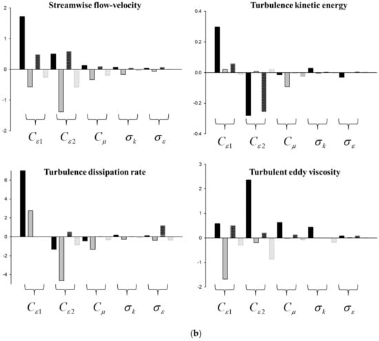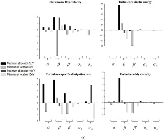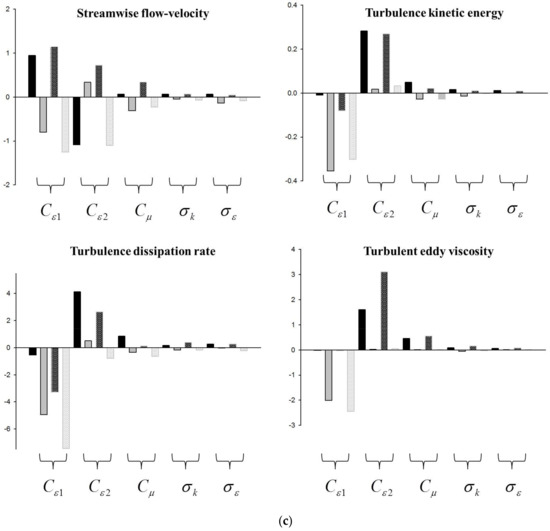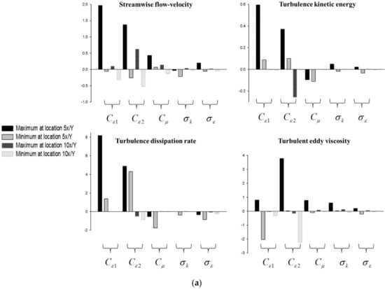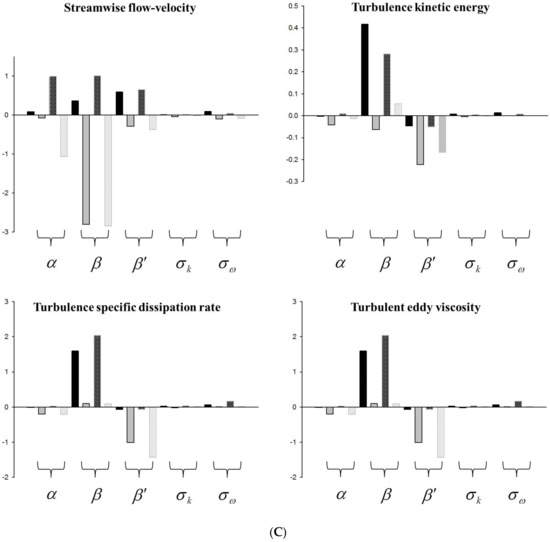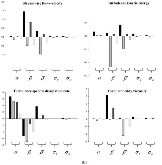 For the turbulence model, the sensitivity coefficients of flow properties of stream-wise flow-velocity (u), turbulence kinetic energy (), turbulence specific dissipation rate (), and turbulent eddy viscosity () with regards to the constants were investigated. Figure 7 presents the extreme values of sensitivity coefficients with respect to the constants. The most sensitive flow property in this turbulence model was turbulence specific dissipation rate and this property was affected mainly by constant, and partially by constant, . The constants , and hardly affected flow properties.