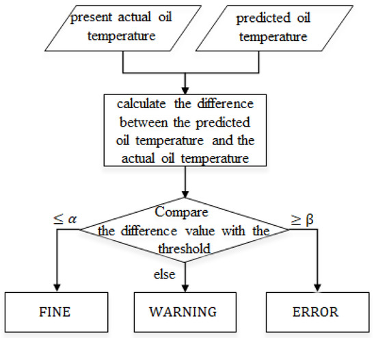 The flowchart of 3-way decision-making rule in Algorithm 2. According to the difference between the predicted oil temperature and actual oil temperature, the 3 transformer states FINE, ERROR, and WARNING were obtained.