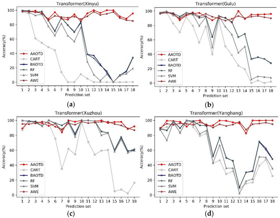 Figure 3 shows the broken line graph of the transformer oil temperature prediction accuracy rate of the six algorithms (CART, RF, SVM, AWE, BAOTD, and AAOTD) on the prediction set. The four subgraphs (a), (b), (c), and (d) of Figure 3 represent the experimental results on transformers at four different locations (Xinyu, Gulu, Xuzhou, and Yanghang). Since these six algorithms were trained using historical working condition data before the prediction timepoint, in the initial stage of prediction, all algorithms already had accurate values for the transformer oil temperature (Figure 3).