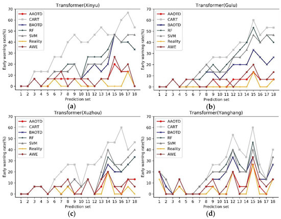 Tendency of abnormal oil temperature warnings from various methods. The 4 subgraphs (a–d) show the results of six algorithms for oil temperature prediction of the transformers in 4 different regions (Xinyu, Gulu, Xuzhou, and Yanghang). The x-coordinate represents the serial number of the prediction set, and the y-coordinate represents the early warning rate of the transformer.