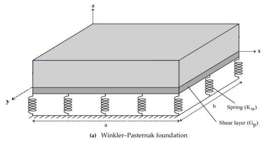 where , , , refer to the shear layer, upper, and lower spring layers, respectively [39]. The last energy contribution related to the external load P acting on the top surface of the plate reads as follows [40]: