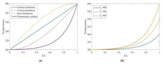 As the thermal behavior of a structure depends on its thermo-mechanical properties, it is worth noticing in Figure 3 that the temperature distribution in thermoelastic solutions is completely different from a uniform or harmonic distribution.