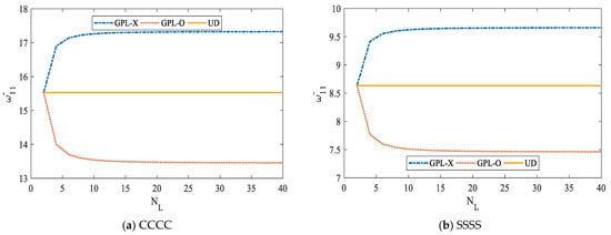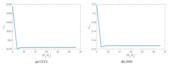 Convergence study of the first fundamental frequency, when assuming a GPL-UD, and : (a) CCCC boundary conditions, (b) SSSS boundary conditions.
