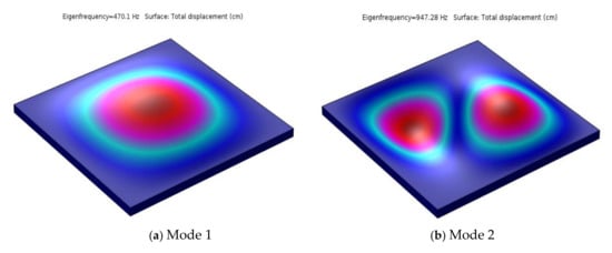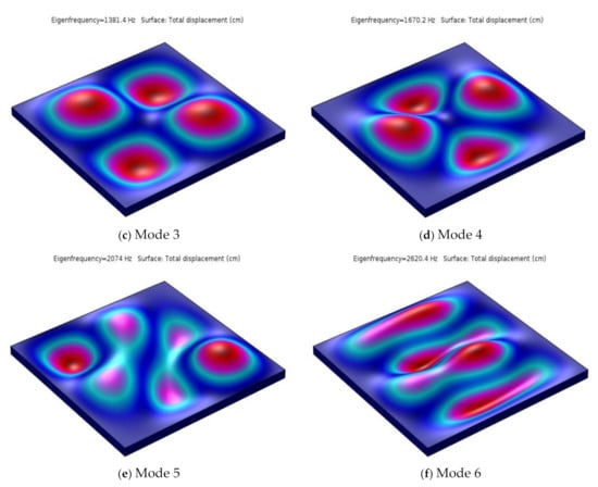 where subscripts and refer to the ceramic and metal phases, respectively, and is the power-law index of the FG material. The mechanical properties of pure ceramic and metal phases are summarized in Table 3, where the ceramic phase features a meaningful higher stiffness than a pure metal. This means that an increased quantity of metal components in the structure would increase its flexibility, as specified in the deflection response of Table 4, for different exponents , in line with findings by References [48,49]. As further validation, we compare our vibration results with finite element predictions as performed in COMSOL, for a square plate with constant thickness , length 250 mm, and different GPL distribution profiles. As the GPLRC plate features an inhomogeneous behavior, the material properties are assumed to be graded in the thickness direction. In Table 5, Table 6 and Table 7, we compare the vibration results for the first six modes, and for three different reinforcement distributions, namely, a GPL–UD, –X, and –O profile, respectively, It is worth noticing the very good matching of results compared to finite elements, with a limited percentage error (lower than 1.04% in each case), despite the reduced computational effort. For a GPL-O distribution we also represent the related mode shapes in Figure 6, while keeping (wt%), with a reasonable kinematic response with the selected simply-supported boundary condition.